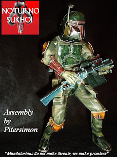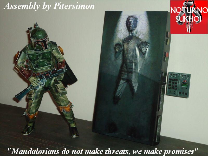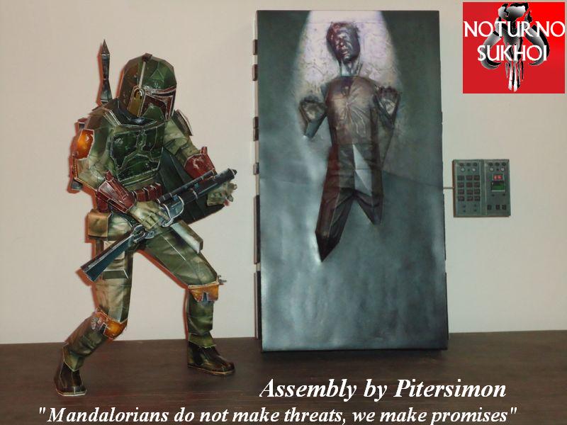 Apesar de ser um clone de Jango Fett, “Boba Fett” não foi alterado pelos “Kaminoanos” a pedido do próprio Jango para ser criado como seu filho, desenvolvendo assim um forte vinculo familiar com o caçador de recompensas. Quando ainda era garoto viu seu “pai” ser decapitado por “Mace Windu” durante a batalha de “Geonosis” e arquitetou, junto com alguns criminosos, sua vingança contra Windu, que acabou fracassando. Já adulto tornou-se o caçador de recompensas mais famoso da galáxia, dando muito trabalho para os amigos de “Han Solo” quando esses tentavam resgatá-lo de "Jabba the Hutt". Boba chegou a ser engolido por um “Sarlacc” que teve uma indigestão com ele e acabou por vomitá-lo! Nesse modelo nosso amigo Pitersimon representa “Boba fett” levando “Han Solo” após ter sido congelado em carbonita para “Jabba”, a fim de receber a recompensa por sua cabeça!